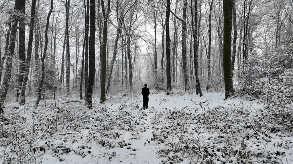 Un paysage normand hivernal, au coucher du soleil, rencontre un texte écrit dans les paysages d’Écosse, en hiver également…